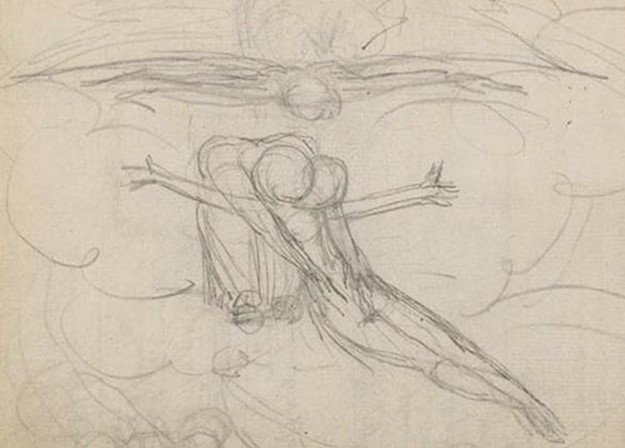 The Painting: William Blake’s, ‘The Sketch of the Trinity’. God the Father, under the wings of the dove-like Holy Ghost, accepts the Son’s offer to give his life for man. The figure of Satan hovers below the clouds. Image taken from Notebook of William Blake. Originally published/produced in England; circa 1787-1818